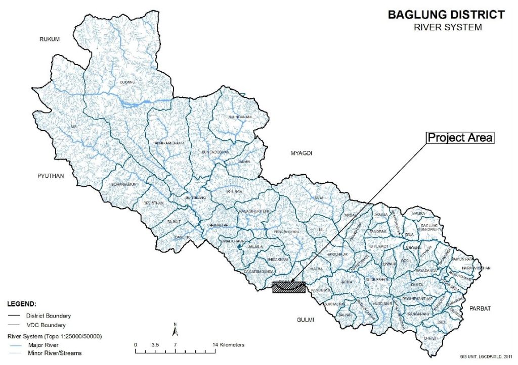 The project area lies primarily in Galkot Municipality, Baglung District and Musikot Municipality, Gulmi District. It utilizes the water from Daram Khola. The project area is about 340 km from Kathmandu and 100 km from Butwal. The nearest market is Hatiya, Galkot. Access road to project site is available from Hatiya/Galkot.
